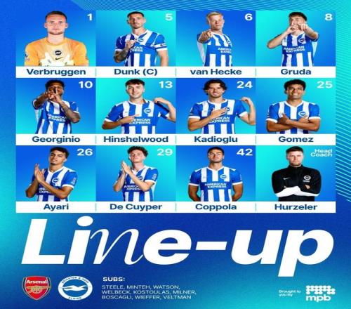布萊頓首發:1-費布魯亨、29-德克伊珀、5-鄧克、6-范黑克、24-卡迪奧盧、42-科波拉、13-欣謝爾伍德、8-格魯達、25-迭戈-戈麥斯、26-阿亞里、10-呂特