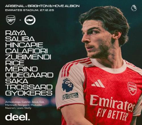 北京時間12月27日23:00,英超第18輪,阿森納主場對陣布萊頓。賽前首發公布。