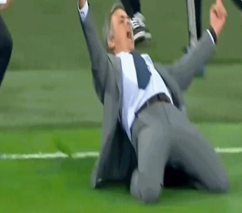 14年前,也就是2012年11月,皇馬3-2絕殺曼城,在C羅打進最后進球后,穆里尼奧再度滑跪慶祝。
