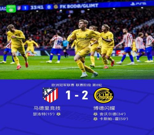 北京時間1月29日歐洲冠軍聯賽 聯賽階段 第8輪,馬德里競技對陣博德閃耀。上半場巴埃納越位在先,頭球破門被吹無效,之后漢茨科送出助攻,瑟洛特搶點頭球破門先拔頭籌,布約爾坎助攻舍沃爾德破門將比分扳平。下半場卡斯帕-霍門前混戰中搶射破門將比分逆轉。隨即全場戰罷,最終比分馬競 1-2 博德閃耀。